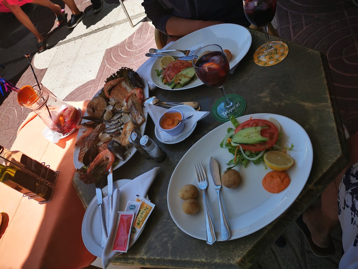 During our first visit I got up from our table to pay by card (leaving a cash tip on the table, which the server couldn't see at that time), the server had 0 problem with me leaving no tip to him (when paying with card), so from my experience they are very polite unlike some of the other reviews say. We came back for dinner to take advantage of their special offer of mixed fish and seafood grill + 1l of Sangria for free } 38€. Definitely worth it! Except for the rich plate of seafood we also got a salad and potatoes with excellent garlicky sauce. Sangria was not the best I've had, but a fair taste for the price. Service is 5 ⭐ all the waiters running were very friendly, talkative, full of enthusiasm and happy to help. They made the whole experience even better. I tend to shy away from places straight on the touristy- beachfront, but this place was a pleasant surprise!